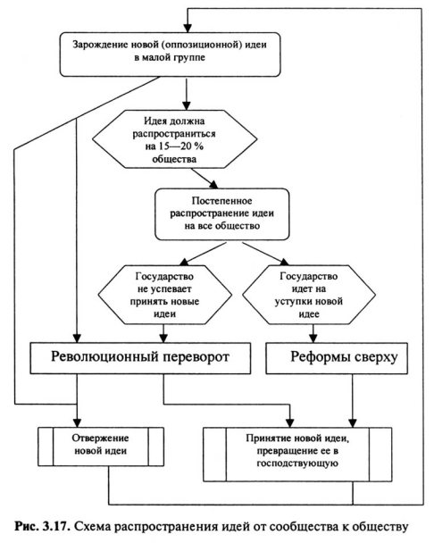 Сначала идея зарождается в малой группе, а так как она требует изменения существующего строя, то находится в оппозиции к идеям, господствующим в момент ее зарождения. Далее идея должна распространиться на 15–20% общества (рис. 3.17).