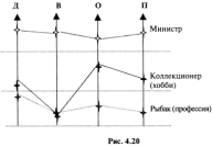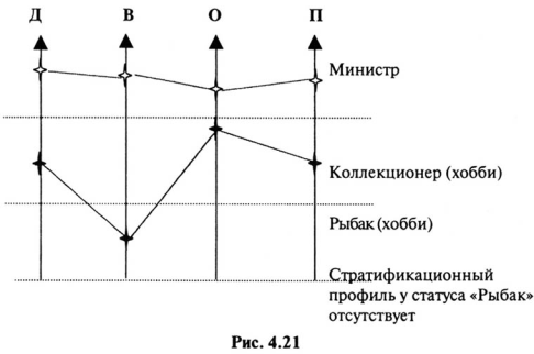 Из первой диаграммы (рис. 4.20) следует, что три статуса несовместимы (стратификационные профили находятся на разных уровнях) и следовательно не могут принадлежать одному и тому же индивиду. Личности, обладающие данными статусами, принадлежат к разным классам: низшему, средне му, высшему.