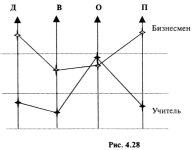 Рассмотрим стратификационную совместимость этих трех статусов. При этом стратификационный профиль возможно построить только для двух статусов «Учитель» и «Бизнесмен», а статус «Стажер» может иметь любой индивид, независимо от его дохода, власти, образования и престижа (рис. 4.28).