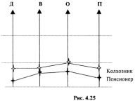 Рассмотрим стратификационную совместимость этих трех статусов. При этом стратификационный профиль воз можно построить только для двух статусов «Колхозник» и «Пенсионер», а статус «Горожанин» может иметь любой индивид независимо от его дохода, власти, образования и престижа (рис. 4.25).