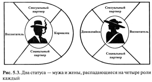 В ролевом наборе мужа и жены обнаруживаются четыре главные роли в каждом. В статус мужа входят такие роли, как социальный партнер, сексуальный партнер, кормилец, социализатор (дисциплинатор, отец своих детей). В структуре ролевого набора статуса «Жена» мы видим практически схожие роли – социальный партнер, сексуальный партнер, домохозяйка, социализатор (дисциплинатор, отец своих детей). Различие двух ролевых наборов заключается в двух ролях – кормильца (муж) и домохозяйки (жена). Выразим ролевой набор или, как еще можно было бы выразиться, ролевую структуру, обоих статусов наглядно (рис. 5.3).