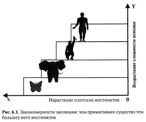 Если построить иерархию живых существ от низших – насекомых, до высших – человека, то по ОУ будет возрастать сложность организации психики живых существ; по ОХ – плотность инстинктов (рис. 6.1).