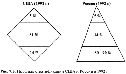 Профиль стратификации – это графическое выражение процентных долей высшего, среднего и низшего классов в составе населения страны (рис. 7.5).