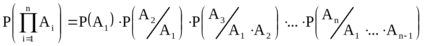 Вероятность произведения N событий равна произведению вероятностей этих событий, причем каждого следующего по порядку события вычисляется при условии, что все предыдущие произошли.