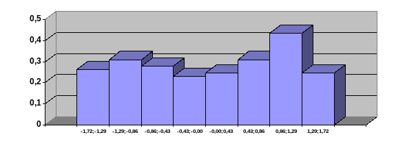 | [ -1.72; -1.29] [ -1.29; -0.86] [ -0.86; -0.43] [ -0.43; -0.00] [ -0.00; 0.43] [ 0.43; 0.86] [ 0.86; 1.29] [ 1.29; 1.72] | 0.113 0.133 0.120 0.100 0.107 0.133 0.187 0.107 | 0.263 0.310 0.279 0.232 0.248 0.310 0.434 0.248 |