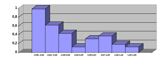| [ -0.95; -0.63] [ -0.63; -0.30] [ -0.30; 0.02] [ 0.02; 0.35] [ 0.35; 0.67] [ 0.67; 1.00] [ 1.00; 1.32] [ 1.32; 1.65] | 0.320 0.200 0.140 0.040 0.100 0.120 0.060 0.040 | 0.984 0.615 0.430 0.123 0.307 0.369 0.184 0.123 |