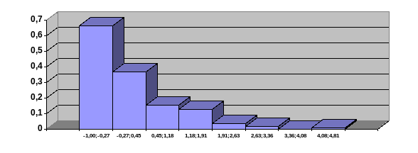 | [ -1.00; -0.27] [ -0.27; 0.45] [ 0.45; 1.18] [ 1.18; 1.91] [ 1.91; 2.63] [ 2.63; 3.36] [ 3.36; 4.08] [ 4.08; 4.81] | 0.480 0.267 0.113 0.093 0.027 0.013 0.000 0.007 | 0.662 0.368 0.156 0.129 0.037 0.018 0.000 0.009 |