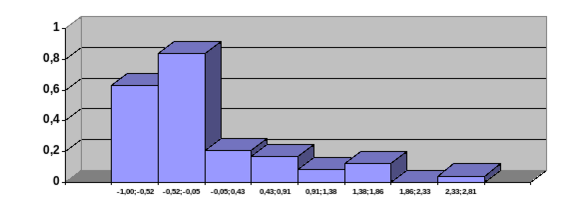 | [ -1.00; -0.52] [ -0.52; -0.05] [ -0.05; 0.43] [ 0.43; 0.91] [ 0.91; 1.38] [ 1.38; 1.86] [ 1.86; 2.33] [ 2.33; 2.81] | 0.300 0.400 0.100 0.080 0.040 0.060 0.000 0.020 | 0.630 0.840 0.210 0.168 0.084 0.126 0.000 0.042 |