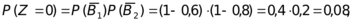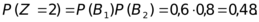 Пример. Два стрелка одновременно выстреливают в мишень. Вероятность попадания для первого равна 0,6, для второго – 0,8. Составить закон распределения случайной величины