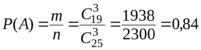 = 2300, а количество возможных способов взять 3 годных изделия из (25 – 6) = 19-ти годных равно