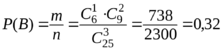 б) Пусть событие В состоит в том, что среди выбранных изделий одно бракованное, т.е. одно бракованное и два годных. Количество возможных способов взять 3 изделия из 25-ти равно