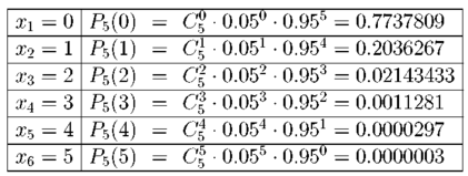 Решение. Дискретная случайная величина X — число нестандартных деталей — имеет биномиальное распределение и может принимать следующие значения: x1 = 0, x2 = 1, x3 = 2, x4 = 3, x5 = 4, x6 = 5. Вероятность нестандартной детали в партии p = 5/100 = 0.05. Найдем вероятности этих возможных значений: