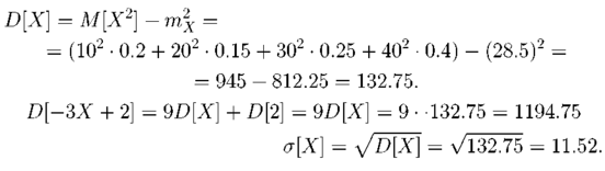 M[2X + 5] = 2M[X] + M[5] = 2M[X] + 5 = 2 · 28.5 + 5 = 62. По формуле (2.19) найдем дисперсию: