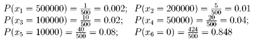 Задача. 2.1.2 Выпущено 500 лотерейных билетов, причем 40 билетов принесут их владельцам выигрыш по 10000 руб., 20 билетов — по 50000 руб., 10 билетов — по 100000 руб., 5 билетов — по 200000 руб., 1 билет — 500000 руб., остальные — без выигрыша. Найти закон распределения выигрыша для владельца одного билета.