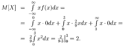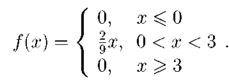 Решение. Найдем дифференциальную функцию распределения f(x). Вне интервала (0, 3) f(x) = 0. На интервале (0, 3) график плотности есть прямая с угловым коэффициентом k = 2/9, проходящая через начало координат. Таким образом,