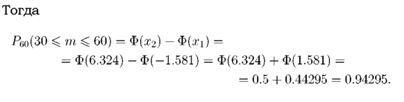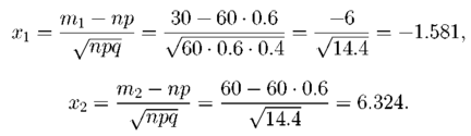 Решение. Количество m появлений события в серии испытаний находится в промежутке [0; 60]. «В большинстве опытов» означает, что m принадлежит промежутку [30, 60.] По условию n = 60, p = 0.6, q = 0.4, m1 = 30, m2 = 60. Вычислим x1 и x2:
