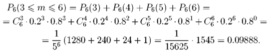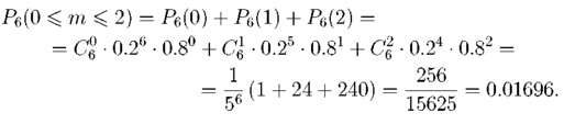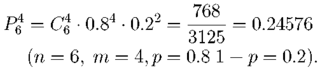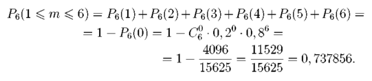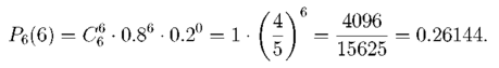 Задача. 1.5.1 По каналу связи передается 6 сообщений. Каждое из сообщений может быть искажено помехами с вероятностью 0.2 независимо от других. Найти вероятность того, что