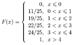 Из свойств F(x) следует, что возможные значения случайной величины X - точки разрыва функции F(x), а соответствующие им вероятности - скачки функции F(x). Находим возможные значения случайной величины X={0,1,2,3,4}.