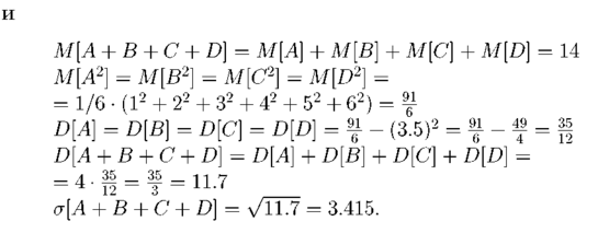 Задача. 2.2.6 Найти математическое ожидание и дисперсию суммы очков, выпадающих на четырех игральных кубиках при одном бросании.