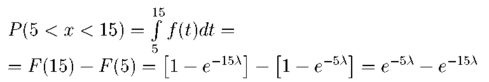 где 1/λ = 10 сек. - среднее время обнаружения цели. Найти вероятность того, что цель будет обнаружена за время от 5 до 15 сек. после начала поиска.