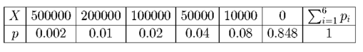 Возможные значения X: x5 = 10000, x4 = 50000, x3 = 100000, x2 = 200000, x1 = 500000, x6 = 0. Вероятности этих возможных значений: