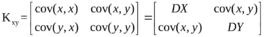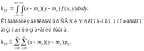 Моментные характеристики пары случайных величин: смешанный второй начальный момент, ковариация, коэффициент корреляции, ковариационная матрица. Свойства ковариации: вычисление ковариации через смешанный второй начальный момент, симметричность, линейность. Смешанный второй начальный момент есть математическое ожидание произведения компонент вектора, т.е. XY = M[XY]. Если произвести преобразование по формуле для зависимых СВ, то M[XY] = (по определению) kXY + M[X]M[Y], где kXY – ковариация. Ковариацией (корреляционным моментом) kXY СВ X и Y называется второй центральный смешанный момент. kXY = (по определению) M[(X-M[X])(Y-M[Y])]. Ковариация непрерывных СВ X и Y равна: Ковариация нормированных СВ называется коэффициентом корреляции. rXY=kXY/XY. Ковариационная матрица: Свойства ковариации: -