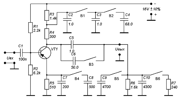 2) Экспериментально исследовать влияние различных элементов (сопротивления нагрузки, емкости разделительного конденсатора, емкости в цепи эмиттера, емкости нагрузки, емкости фильтра) усилителя на частотную характеристику (АЧХ). По результатам эксперимента на одном графике построить нормированные АЧХ, определить граничные частоты и их зависимость от значений элементов схемы усилителя.