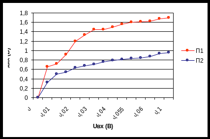 | Uвх, V | 0 | 0,005 | 0,01 | 0,015 | 0,02 | 0,025 | 0,03 | 0,035 | 0,04 | 0,045 | 0,055 | 0,06 | 0,06 | 0,09 | 0,1 |
