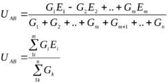 Напряжение между двумя узлами равно сумме произведений проводимости и ЭДС, каждой ветви деленной на сумму проводимости ветвей схемы.
