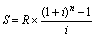 Второй сомножитель этого выражения – ((1 + i)n – 1) / i – называется множителем наращения аннуитета. Так же как и в случае с начислением процентов на единичные суммы, значения таких множителей табулированы, что позволяет облегчить процентные вычисления денежных потоков.