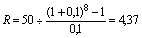 Аналогичный подход может быть применен к формированию амортизационного фонда. Известно, что амортизация основных фондов – важнейшая составная часть чистого денежного потока предприятия, остающаяся в его распоряжении. В каждом рубле получаемой предприятием выручки содержится доля амортизационных отчислений. Поэтому нет ничего противоестественного в том, чтобы предприятие, “расщепляя” поступающую выручку, перечисляло на банковский депозит сумму амортизации по каждому платежу от покупателя. В этом случае накопление амортизационного фонда происходило бы значительно быстрее за счет начисления процентов. Предположим, что по основным фондам первоначальной стоимостью 50 млн. рублей предприятие начисляет амортизацию по годовой ставке 12,5% (линейный метод). Срок службы оборудования 8 лет. Ежегодно начисляется 6,25 млн. рублей амортизационных отчислений. Но если предприятие располагает возможностью размещения денежных средств хотя бы под 10% годовых, то для накопления 50 млн. рублей в течение 8 лет ему понадобится ежегодно размещать на депозите лишь по 4, 37 млн. рублей: преобразовав формулу (2) из предыдущей главы, получим: