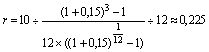 Размер долга по займу (10 млн. рублей) был задан как условие предыдущего примера. На самом деле, часто данный параметр также является вычисляемой величиной, т.к. наряду с основной суммой займа должник обязан выплачивать проценты по нему. Предположим, что 10 млн. рублей – это основная задолженность по облигационному займу, кроме этого необходимо ежегодно выплачивать кредиторам 10% основной суммы в виде процентов. Чему будет равна сумма ежемесячного взноса в погасительный фонд с учетом процентных выплат по займу? Так как проценты должны выплачиваться ежегодно и их годовая сумма составит 1 млн. рублей (10 млн. рублей * 10%), нам опять следует рассчитать член ренты r (R / 12) по ренте сроком n = 1 год, p = 12, m =1, i = 15%. По базовой формуле (6) его величина составит: