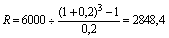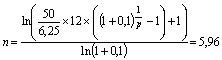Ежемесячный взнос на депозит должен составить около 350 тыс. рублей (более точно – 348,65). При этом ежемесячные амортизационные отчисления по линейному методу составят 520,8 тыс. рублей (6,25 / 12). Задачу можно сформулировать иначе: за сколько лет предприятие возместит первоначальную стоимость основных средств, размещая на депозите сумму амортизационных отчислений по линейному методу (520,8 тыс. рублей в месяц или 6,25 млн. рублей в год). Для решения этой задачи (нахождение срока ренты n) снова понадобится формула (6), но теперь она будет преобразована следующим образом: