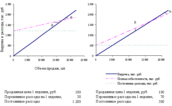 На этом рисунке отображены графики безубыточности для двух предприятий, выпускающих аналогичные изделия, реализуемые по одной и той же цене. Разница заключается в затратах на их производство: у одного предприятия более высокие переменные, но более низкие постоянные издержки, у другого – наоборот. Неудивительно, что у предприятия с более высокими фиксированными расходами график безубыточности сдвинут вверх. Критический объем продаж для первого предприятия составляет ≈17143 изделия (1200 / (100 – 30), а для второго ≈ 16667 изделий (500 / (100 – 70). После прохождения критической точки, предприятия полностью покрывают свои постоянные издержки и начинают получать операционную прибыль. Сравнивая между собой углы, под которыми пересекаются линии полной себестоимости и выручки (α), можно заметить, что для предприятия с низкими фиксированными расходами этот угол более острый. То есть, расширение зоны прибыли происходит у него значительно медленнее, чем у предприятия с более высокими постоянными затратами. Получается, что в данной ситуации высокий уровень фиксированных издержек является благом: он как рычаг усиливает влияние даже небольшого прироста объема продаж.