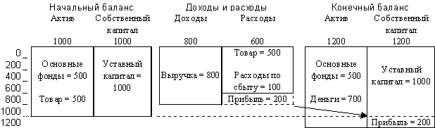 Как видно из схемы, первоначальная величина активов предприятия составляла 1000. Реализовав товар дороже его себестоимости, предприятие увеличило стоимость своих активов до 1200. Эта операция нарушила равновесие баланса, т.к. у предприятия не возникло соответствующего обязательства на величину разницы между себестоимостью и продажной ценой. Для восстановления равновесия в состав собственного капитала была введена новая статья “Прибыль”, сумма которой (200) равна этой разнице. В результате собственный капитал предприятия составил 1200. Владельцы предприятия стали богаче на величину полученной прибыли.