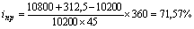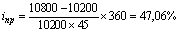 Если предположить точную временную базу (t = 365 дней), то доходность операции составит 40,56%. Допустим, что данный сертификат был приобретен дороже номинала – за 10 тыс. 200 рублей и продан через 45 дней за 10 тыс. 800 рублей. Тогда его фактическая годовая доходность (при t = 360) составит 47,06%: