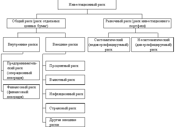 Такая трактовка риска позволила унифицировать подход к его различным видам. С позиции конкретного предприятия существует большое число видов самых разнообразных рисков, которые могут повлиять на уровень доходности реализуемых проектов: риск процентной ставки, валютные риски, инфляционный, политический, страновый и многие другие виды рисков. Однако, с позиции инвестора все эти риска могут быть объединены в одну группу – общий риск или риск отдельных ценных бумаг (рис. 5.4.1). Наряду с перечисленными видами общего риска, внешними по отношению к предприятию, существуют внутренние общие риски, для измерения которых используются показатели операционного и финансового левериджа. Первый из них был рассмотрен в гл. 3 данного пособия, о втором речь пойдет несколько позже.