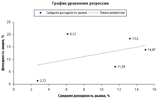 Приведенные в таблице данные позволяют сопоставить между собой изменения доходности отдельной акции и доходности рынка в целом. Если в предыдущем параграфе находилась теснота связи между отдельными акциями, входящими в инвестиционный портфель, то теперь можно найти степень зависимости доходности одной акции от уровня прибыльности всего рынка. В статистике подобные задачи решаются путем построения регрессионных уравнений вида: