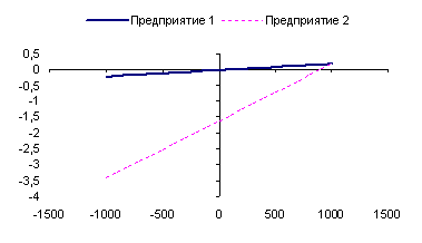 Нанеся эти значения на график (рис. 5.7.1), можно видеть, что чистая прибыль на 1 акцию второго предприятия растет быстрее, чем первого, относительно операционной прибыли. То есть в случае роста операционной прибыли на 1 процентный пункт, чистая прибыль на 1 акцию у второго предприятия увеличится значительно быстрее. Точно так же она будет быстрее снижаться при уменьшении операционной прибыли на 1 пункт.