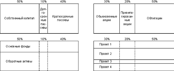 В руках менеджеров сосредотачивается весь предоставленный им капитал и они вправе вкладывать его любым способом, приносящим максимальную выгоду инвесторам. Аналогично, при планировании инвестиций не следует предполагать, что какой-то конкретный проект будет финансироваться только за счет банковского кредита, а для реализации другого будет произведена новая эмиссия акций. Менеджеры должны определить общий объем инвестиций и изыскать под него полную сумму финансирования из всех источников. Доходность отдельных проектов должна сравниваться с общей или средней ценой всего вновь привлекаемого капитала, так как каждый рубль инвестиций будет отражать в себе всю структуру капитала, из которого они финансируются, например: 30% обыкновенные акции, 20% привилегированные акции, 50% облигации (рис. 6.1.1.б).