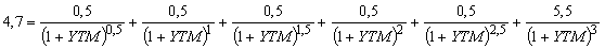 Например, предприятие получает в банке 10 млн. рублей на 1,5 года под номинальную ставку 22% годовых с ежемесячным реинвестированием начисленных процентов. По условиям кредитного договора уплата банку начисленных процентов должна производиться ежеквартально в течение всего срока ссуды. По окончании срока предприятие должно вернуть банку основную сумму долга. Таким образом, каждые три месяца предприятие должно будет выплачивать банку по 560,15 тыс. рублей (расчеты выполнены по формуле (2.2.13) с параметрами: P = 10000 тыс. руб., n = 0,25 года (1 квартал = 1/4 или 3/12 года), m = 12, j = 22%). Последняя выплата в конце срока составит 10560,15 тыс. рублей (10000 + 560,15). Полуторагодовой период включает в себя 6 кварталов, следовательно денежный поток по данной операции будет иметь вид: (+10000; -560,15; -560,15; -560,15; -560,15; -560,15; -10560,15). YTM этого потока найдем из формулы (5.2.2):