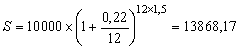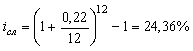 Тогда денежный поток будет иметь вид (+10000; -13868,17). По формуле (2.2.15) находим, что его уравнивает эффективная процентная ставка 24,36%, то есть для предприятия этот вариант абсолютно равнозначен предыдущему и периодичность выплаты начисленных процентов не оказывает влияния на цену привлекаемого капитала. Точно такой же результат будет получен, если рассчитать сложную эффективную процентную ставку, эквивалентную номинальной ставке 22% годовых. По формуле (39) в табл. (2.2.3) получаем: