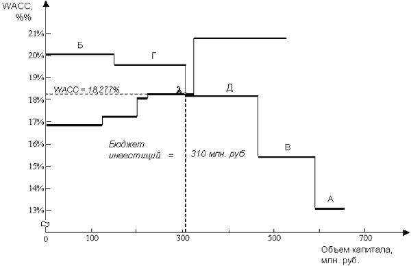 Привлечение дополнительных ресурсов по более высокой цене не будет иметь смысла, так как у предприятия уже не останется проектов, обеспечивающих доходность более высокую, чем эта цена. Графическая интерпретация данного утверждения заключается в том, что привлекаться должен лишь тот капитал, цена . Предприятие будет способнокоторого на графике WACC отображена левее точки приобрести по цене не выше, чем 18,277%, дополнительный капитал в объеме 325 млн. рублей. С другой стороны, включению в бюджет капвложений подлежат только – проекты Б и Г. Проект Д расположен нижепроекты, отраженные выше точки предельной точки (его доходность равна 18,19%), поэтому реализация этого проекта нецелесообразна.