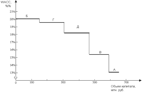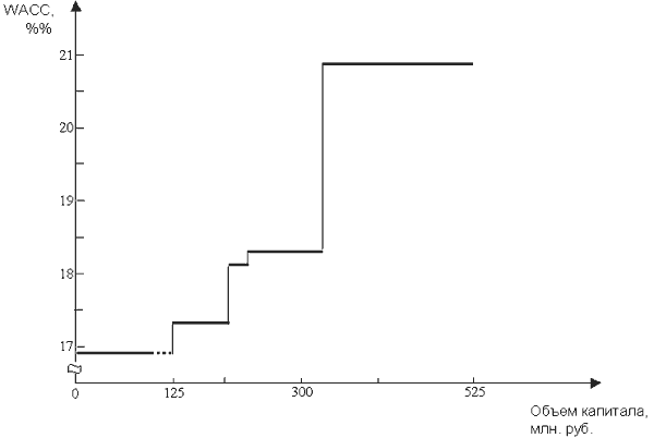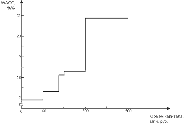 Наличие четырех точек излома означает, что на графике WACC будет 5 горизонтальных отрезков: от 0 до 100, от 100 до 175, от 175 до 200, от 200 до 300, от 300 до 500 млн. рублей. Рассчитаем среднюю цену капитала для каждого из них, используя формулу (6.4.1).