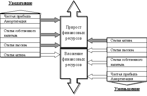 Можно вывести общее правило: увеличение статей собственного капитала и пассива, а также уменьшение статей актива отражают прирост финансовых ресурсов. Увеличение активных статей и снижение статей из правой стороны баланса свидетельствует об использовании (вложении или инвестировании) финансовых ресурсов (рис. 1.3.1). Не все финансовые ресурсы предприятия находят полное отражение в бухгалтерском балансе: в нем показывается только нераспределенная (реинвестированная) часть прибыли, в то время как реальным ресурсом является общая величина заработанной предприятием чистой прибыли. Поэтому, в качестве статьи прироста финансовых ресурсов следует брать общую сумму чистой прибыли из Отчета о прибылях и убытках, а сумму выплаченных дивидендов отражать как вложение финансовых ресурсов. Еще одним важным источником финансовых ресурсов является амортизация основного капитала, сумма которой вообще не может быть определена из бухгалтерского баланса. Основной капитал отражается в нем по остаточной стоимости, то есть за минусом начисленного износа. Следовательно,