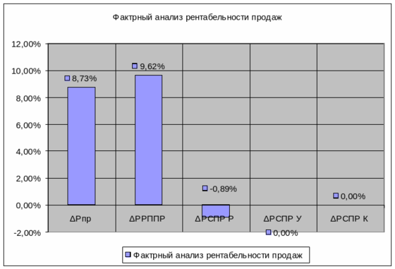 ΔРСпрс = ΔРСпр р + ΔРСпр у + ΔРСпр к, где ΔРРПΠΡ - составляющая, характеризующая влияние изменения себестоимости продукции на динамику рентабельности продаж, ΔРСпрс - составляющая влияние, характеризующая изменения объема выручки на динамику рентабельности продаж, ΔРСпр р - составляющая, характеризующая влияние изменения себестоимости продаж товаров, продукции, работ, услуг на динамику рентабельности продаж, ΔРСпр у - составляющая, характеризующая влияние изменения управленческих расходов на динамику рентабельности продаж, ΔРСпр к - составляющая, характеризующая влияние изменения коммерческих расходов на динамику рентабельности продаж.