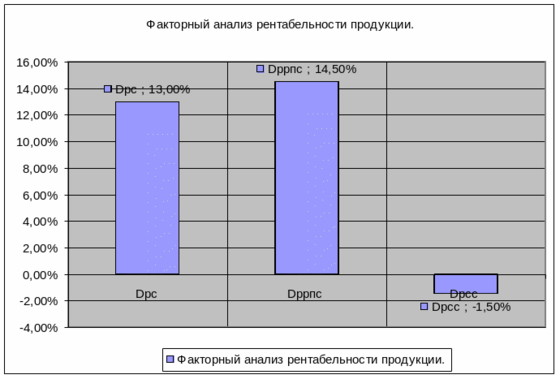 Общее изменение рентабельности продукции, возросла на 13.00%, за счет изменения себестоимость продукции она уменьшилась на 1.5%, и за счет изменения объема продукции увеличилась на 14.50%