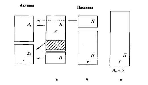 На рис. 2.2. отражены различные варианты структуры пассивов предприятия при одинаковой структуре активов. Как видно, опасными являются ситуации «б)» и «в)».