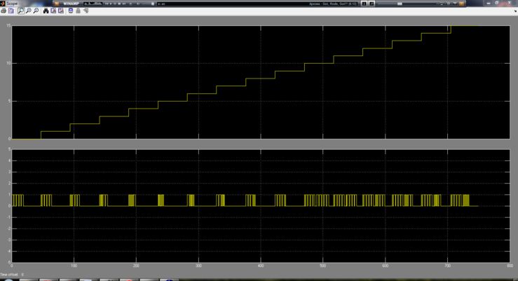 Результаты моделирования приведены на рис. 2 (сверху величина входного кодируемого сигнала, снизу – код «Морзе»).