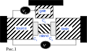 П омимо низких температур другой проблемой является емкость – она складывается из емкости не только самого конденсатора, но и всех контактов и тел в окрестности установки. Создателями одноэлектроники был найден простой и изящный выход из этой ситуации – создать систему из двух конденсаторов (рис.1). Если еще над проводником, соединяющим конденсаторы – островком (island рис. 1) расположить электрод - затвор (gate), наводящий на нем заряды, то получим одноэлектронный транзистор, в котором проводимость канала между истоком (source) и стоком (drain) изменяется путем подачи управляющего напряжения на затвор. Систему можно рассматривать как предельный случай полевого транзистора с изолированным затвором. Однако так как усиление по мощности в данной схеме не происходит, то лучше было бы говорить не об одноэлектронном транзисторе, а об одноэлектронном ключе, но … о терминах не спорят.